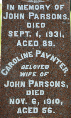 | Burial | She was buried in the United Church Cemetery, Stanley Bridge, Queens County, Prince Edward Island, Canada, 46.46172, -63.45491G. In Memory of / John Parsons / Died / Sept. 1, 1931 / Aged 89 / Caroline Paynter / Beloved / Wife of / John Parsons / Died / Nov. 6, 1910, / Aged 56.4 Tombstone, John Parsons Sr. (1842-1931), his wife Caroline Paynter (1854-1910). United Church Cemetery, Stanley Bridge, Queens County, Prince Edward Island, Canada.  Inscription detail. |