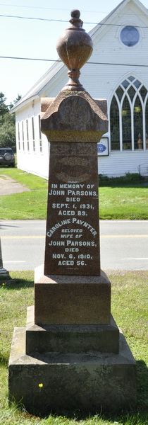 - [S9383] Cemetery marker, Stanley Bridge United Church Cemetery, Queens County, Prince Edward Island, Canada. John Parsons Sr. & Caroline Paynter, tombstone inscription; read by David A. Walker, 10 September 2014.