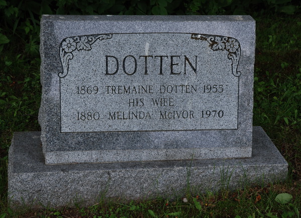 Inscription: DOTTEN / 1869 Tremaine Dotten 1955 / His Wife / 1880 Melinda McIvor 1970.1,2  Tombstone, William Tremaine Dotten (1869-1955) and his wife Melinda McIvor (1880-1970). Dotten Burial Ground, North Wallace, Cumberland County, Nova Scotia, Canada.