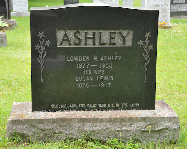 | Burial | She was buried in the United Church Cemetery, Cascumpec, Prince County, Prince Edward Island, Canada, 46.76377, -64.10783G. Inscription: ASHLEY / Lowden H. Ashley / 1877 - 1953 / His wife / Susan Lewis / 1878 - 1947 / Blessed are the dead who die in the Lord.3,1 Tombstone, Lowden H. Ashley and his wife, Susan Lewis. United Church Cemetery, Cascumpec, Prince County, Prince Edward Island, Canada. |