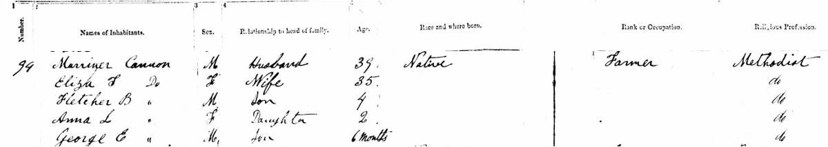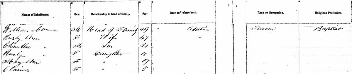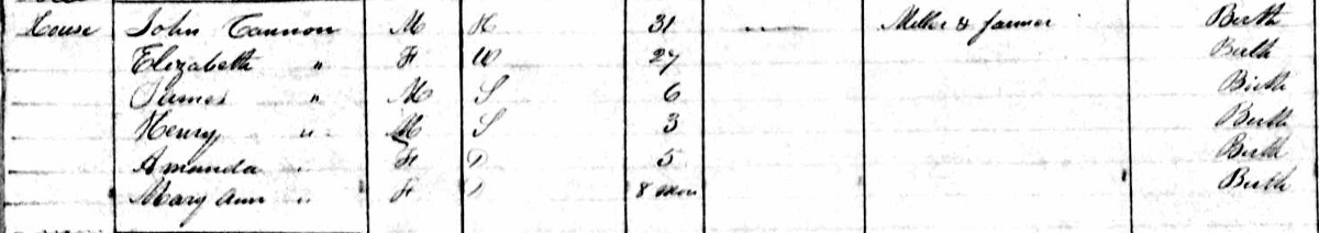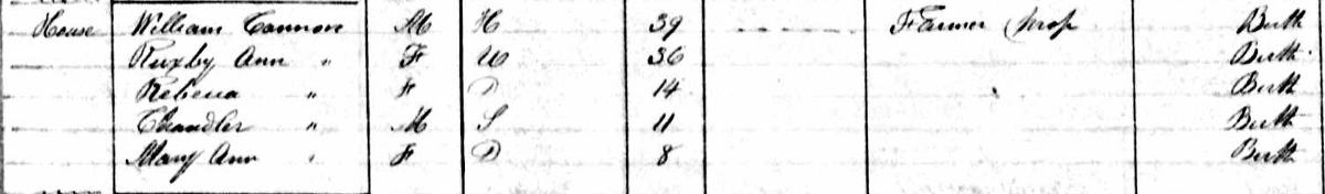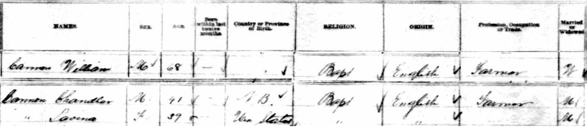 | Census | He was head of the household in the census in 1861 in Hillsborough, Albert County, New BrunswickG. included in the household with William (age 49) were his wife Ruxby (age 47), their children Chandler (age 21), Ruxby (age 10), Mary Ann (age 19) and Clarissa (age 5). William was a farmer. The family religion was Baptist.4 1861 Canada Census, Parish of Hillsborough, Albert County, New Brunswick. Household of William Cannon, his wife Ruxby, their children Chandler, Ruxby, Mary Ann and Clarissa. |
