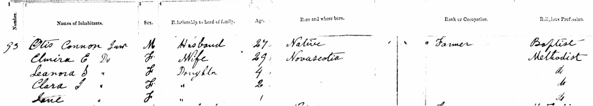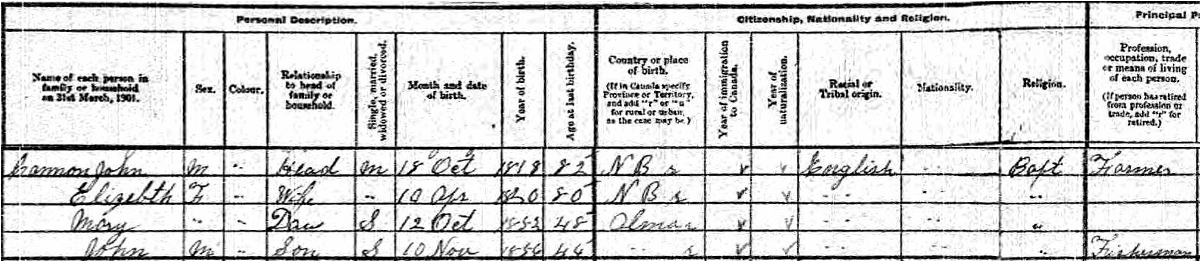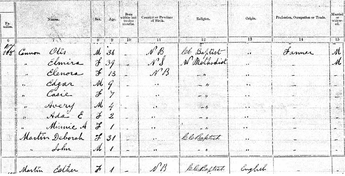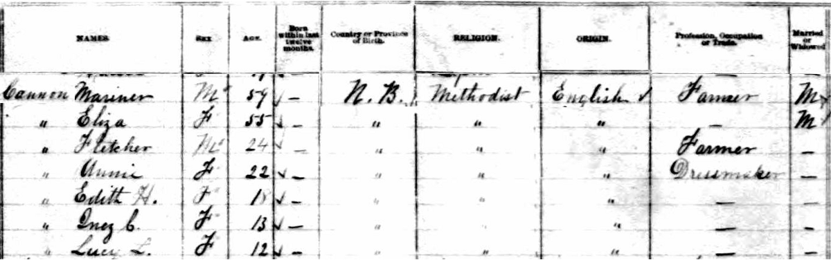 | Witness | She was enumerated on the census in 1871 in the household of Otis Cannon, Jr., in Harvey, Albert County, New Brunswick, CanadaG. included in the household with Otis Jr. (age 36) were his wife Elmira (age 39), their children Elenora/Leanora (age 13), Edgar (age 9), Cassie (age 7), Avery (age 4), Ada (age 2) & Minnie (age 1), and a likely unrelated Deborah Martin (age 31) and her two children, John (age 1) and Esther (age 1). Otis was a farmer. He was Closed Communion Baptist, his wife and children were Wesleyan Methodists, Deborah Martin & her children were Closed Communion Baptists. Deborah's marital status was not recorded, she was not able to read or write. She was recorded as "A Parish Charge", which probably means that she was not able to care for herself and children, and the parish had taken on the responsibility of caring for her.7 1871 Census of Canada, Harvey, Albert County, New Brunswick. Household of Otis Cannon Jr., his wife Elmira Smith, their children Elenora/Leanora, Edgar, Cassie, Avery, Ada and Minnie. There was also a likely unrelated Deborah Martin and her two children. |