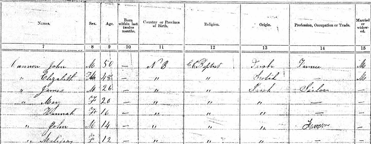 - [S8294] 1851 Canada Census, Harvey, Albert County, New Brunswick, household of William Cannon, 1851, digital copy of original image, LAC Film C_994. Library & Archives Canada, Library & Archives Canada; 395 Wellington St., Ottawa,, Ontario, Canada.