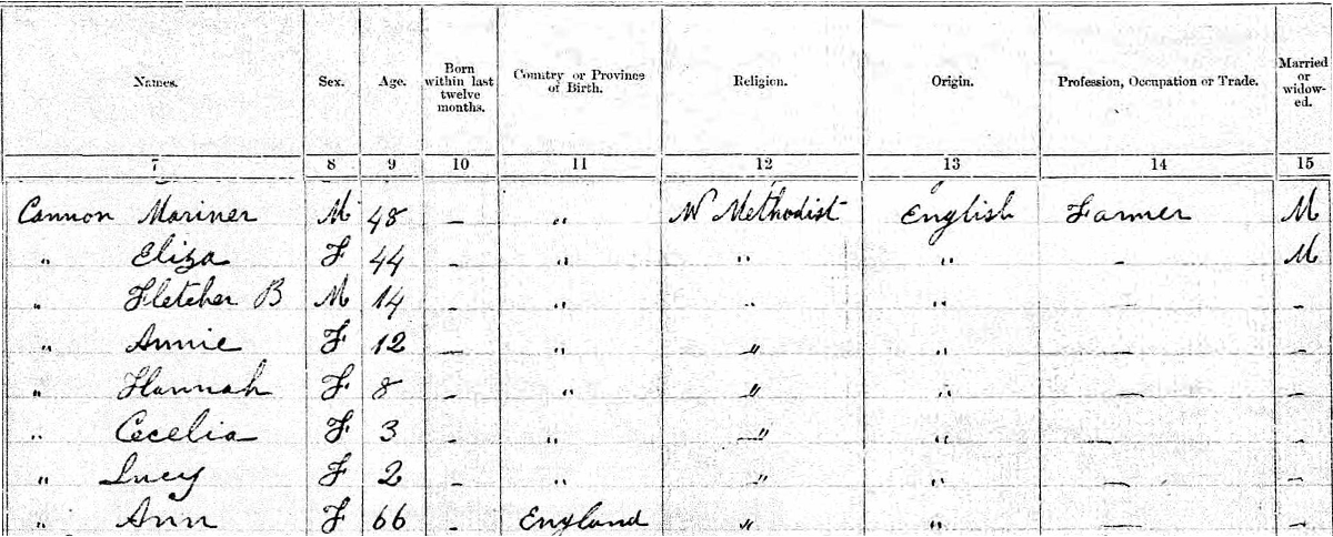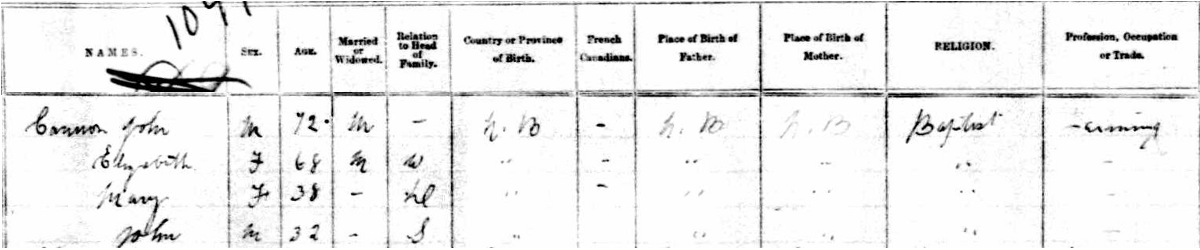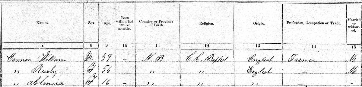 | Census | He was head of the household in the census in 1871 in Hillsborough, Albert County, New Brunswick, CanadaG. included in the household with William (age 59) were his wife Ruxby (age 56) and daughter Almira (age 16). William was a farmer. The family religion was Closed Communion Baptist. They were enumerated next to their son Chandler and his wife Lavinia. Two enumerations earlier there was an unknown 6 year old George Cannon, in the household of Henry Collins and his family.5 1871 Canada Census, Parish of Hillsborough, Albert County, New Brunswick. Household of William Cannon, his wife Ruxby, their daughter Almira. |
