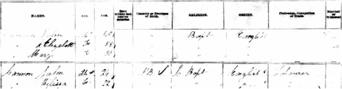 | Census | He was head of the household in the census in 1851 in Harvey, Albert County, New BrunswickG. included in the household with William (age 39) were his wife Ruby/Ruxby Copp (age 36), their children Rebecca (age 14), Chandler (age 11) and Mary Ann (age 8). William was a farmer (proprietor).3 1851 Census of Canada East, Canada West, New Brunswick and Nova Scotia. Household of William Cannon, his wife Ruby Copp, their children Rebecca, Chandler and Mary Ann. |