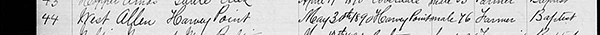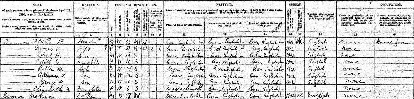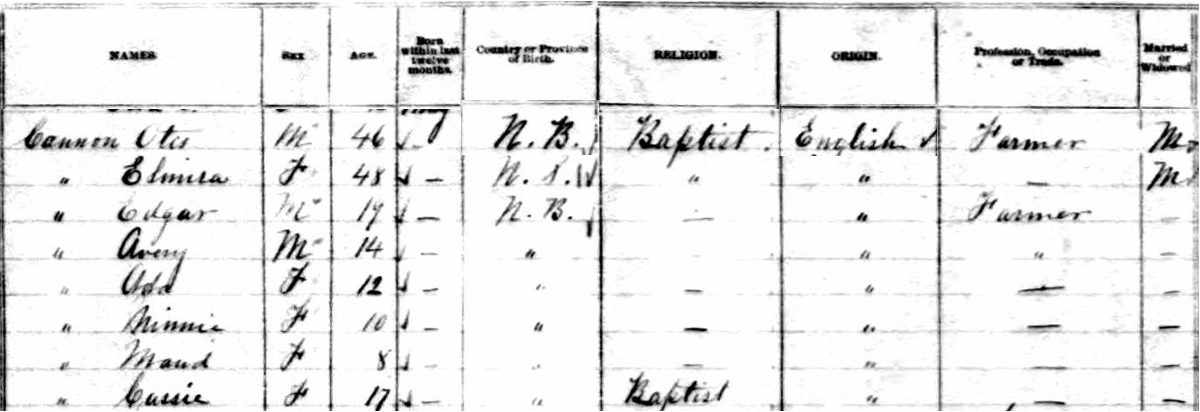 | Witness | She was enumerated on the census in 1881 in the household of Otis Cannon, Jr., in Harvey, Albert County, New Brunswick, CanadaG. included in the household with Otis (age 46) were his wife Elmira (age 48), their children Edgar (age 19), Avery (age 14), Ada (age 12), Minnie (age 10), Maud (age 8) and Cassie (age 17). Otis and Edgar were farmers. The family religion was Baptist.8 1881 Canada Census, Harvey, Albert County, New Brunswick. Household of Otis Cannon Jr., his wife Elmira, their children Edgar, Avery, Ada, Minnie, Paulina Maud & Cassie. |