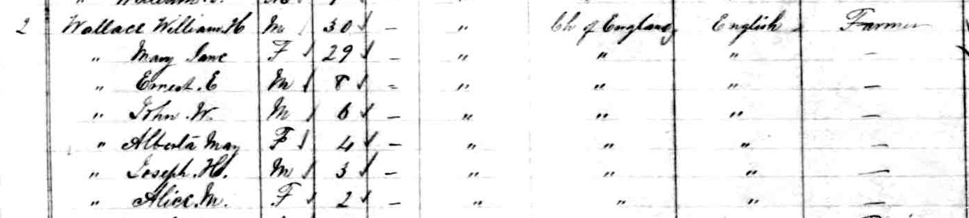 | Witness | She was enumerated on the census on 4 April 1881 in the household of William Henry Wallace in Lot 5, Prince County, Prince Edward Island, CanadaG. included in the household were his wife Mary Jane (Ashley), sons Ernest, John & Joseph, and daughters Alberta May & Alice. William was listed as a farmer. The family religion was Church of England.1 1881 Canada Census, William Henry Wallace and family, Lot 5, Prince County, Prince Edward Island, Canada. |