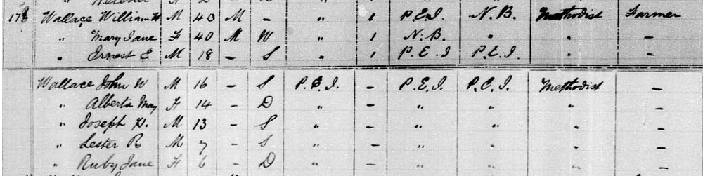 | Witness | She was enumerated on the census in 1901 in the household of William Henry Wallace in Lot 5, Prince County, Prince Edward Island, CanadaG. included in the household with William (age 53) were his wife Mary Jane Ashley (age 52), their children Ernest (age 28), his wife Susie Brundage (age 25), John (age 25), Alberta (age 24), Joseph (age 22), Lester (age 18) and Ruby (age 15). William was a farmer, Ernest, John, Joseph & Lester were farmer's sons. The family religion was Methodist.7 |