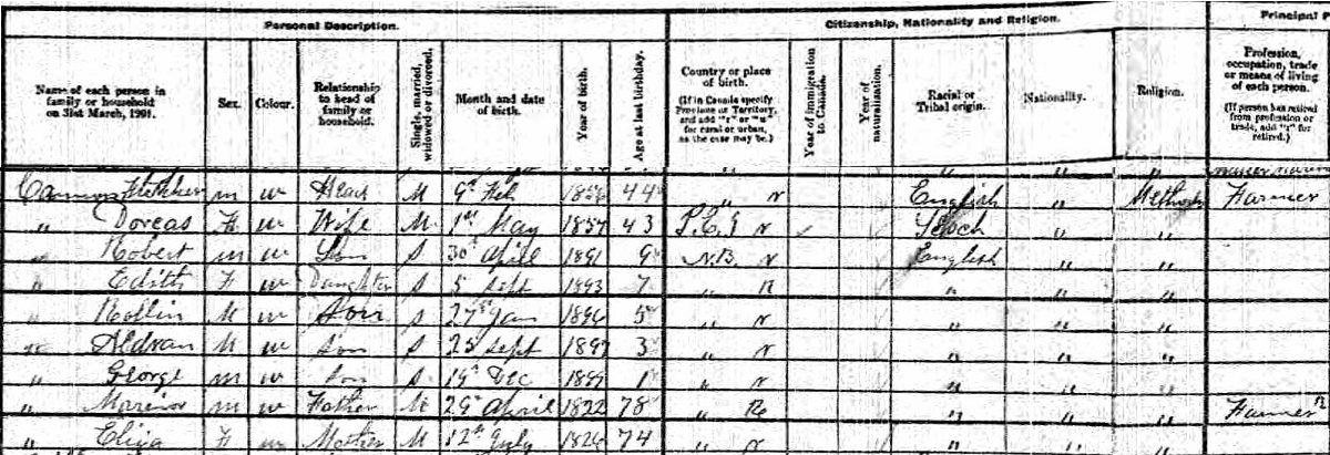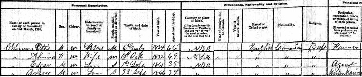 | Witness | She was enumerated on the census on 9 April 1891 in the household of Otis Cannon, Jr., in Harvey, Albert County, New Brunswick, CanadaG. included in the household with Otis (age 56) were his wife Elmira (age 59), their children Edgar (age 29), Avery (age 24) and Minnie (age 21). Otis was a farmer; no occupations were recorded for Edgar or Avery. The family religion was Baptist.9 1891 Canada Census, Harvey, Albert County, New Brunswick. Household of Otis Cannon Jr., his wife Elmira, their children Edgar, Avery and Minnie. |