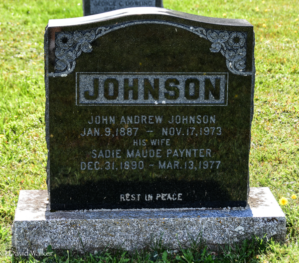 Inscription: JOHNSON / John Andrew Johnson / Jan. 9, 1887 - Nov. 17, 1973 / His Wife / Sadie Maude Paynter / Dec. 31, 1890 - Mar. 13, 1977.1,3  Cemetery Marker: John Andrew Johnson (1887-1973), his wife Sadie Maude Paynter (1890-1977). United Church Cemetery, Margate, Prince County, Prince Edward Island, Canada.