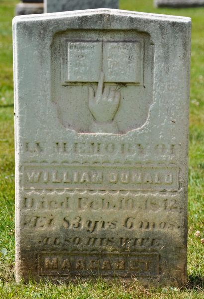 | Burial | He was buried in the Peoples Cemetery, Malpeque, Prince County, Prince Edward Island, Canada, 46.52983, -63.68682G. Inscription: In Memory of / William Donald / Died Feb. 10, 1842, / Æt. 83 yrs 6 mos. / Also His Wife / Margaret [rest below ground] / Died Apr. 24 1867 / Æt. 94 yrs 17 ds.3 Tombstone, William Donald (1758-1842), His wife Margaret Woodside (1773-1867). Peoples Cemetery, Malpeque, Prince County, Prince Edward Island, Canada. |