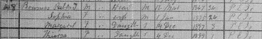 | Witness | She was enumerated on the census on 31 March 1901 in the household of Reuben Tuplin Bowness in Montrose, Prince County, Prince Edward Island, CanadaG. included in the household of Reuben Bowness were his wife Sophia (Mountain), and daughters Margaret & Theresa/Thursa.4 1901 Canada Census, household of Reuben Bowness, his wife Sophia (Mountain), and daughters Margaret & Theresa/Thursa. His religion was entered as Methodist, while his wife and daughters were Presbyterian. Reuben was a farmer. |
