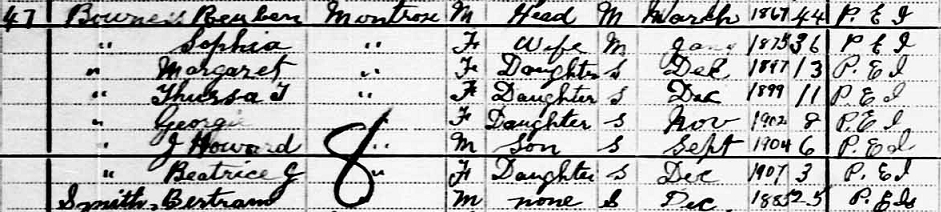 | Census | He was head of the household in the census in June 1911 in Montrose, Prince County, Prince Edward Island, CanadaG. included in the household of Reuben Bowness were his wife Sophia (Mountain), daughters Margaret, Theresa/Thursa, Georgie & Beatrice, and son Howard. Bertrand Smith, aged 25 and unrealted, was also listed.4 1911 Canada Census, household of Reuben Bowness, his wife Sophia (Mountain), daughters Margaret, Theresa/Thursa, Georgie & Beatrice, and son Howard. Bertrand Smith, aged 25 and unrelated, was also listed. |
