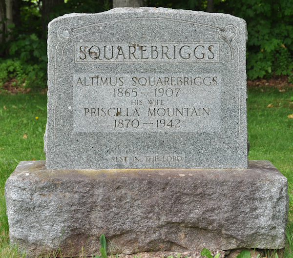 Inscription: SQUAREBRIGGS / Altimus Squarebriggs / 1865 - 1907 / His Wife / Priscilla Mountain / 1870 - 1942 / Rest in the Lord.4  Tombstone, Altimus Squarebriggs (1865-1907) and his wife Priscilla Mountain (1870-1942). Montrose United Church Cemetery, Montrose, Prince County, Prince Edward Island.