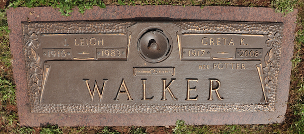 Inscription: J. Leigh / 1916 - 1983 | Greta K. / 1917 - 2008 // Together Forever / WALKER.3,2  Tombstone, Leigh Walker (1916-1983), his wife Greta Potter (1917-2008). Floral Hills Memorial Gardens, Pleasant Valley, Queens County, Prince Edward Island, Canada.