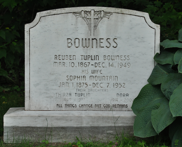 | Burial | He was buried in the United Church Cemetery, Montrose, Prince County, Prince Edward Island, Canada, 46.86708, -64.07278G. Inscription: BOWNESS / Reuben Tuplin Bowness / Mar. 10, 1867 - Dec. 14, 1949 / His Wife / Sophia Mountain / Jan. 1, 1875 - Dec. 7, 1952 / Their Daughters / Thirza Tuplin 1899 - 1977 / Dora 1914 - 2002 / All Things Change But God Remains.2 Tombstone, Reuben Tuplin Bowness (1867-1949), his wife Sophia Mountain (1875-1952), and their daughters Thirza Tuplin (1899-1977) and Dora (1914-2002). Montrose United Church Cemetery, Montrose, Prince County, Prince Edward Island, Canada. |
