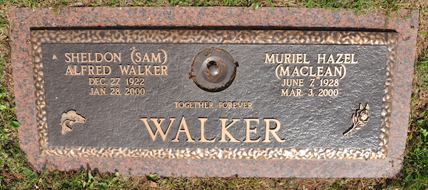 Inscription: Sheldon (Sam) / Alfred Walker / Dec. 27, 1922 / Jan. 28, 2000 | Muriel Hazel / (MacLean) / June 7, 1928 / Mar. 3, 2000 // Together Forever / WALKER.2  Tombstone, Sheldon 'Sam' Alfred Walker (1922-2000), his wife Muriel Hazel MacLean (1928-2000). Floral Hills Memorial Gardens, Pleasant Valley, Queens County, Prince Edward Island, Canada.