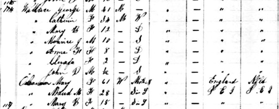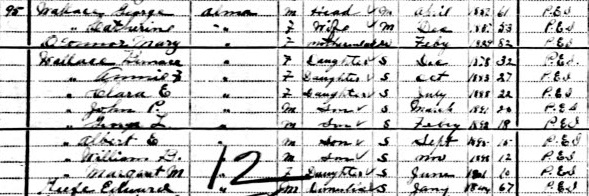 | Census | George Wallace was head of the household in the census on 23 April 1891 in Lot 3, Prince County, Prince Edward Island, CanadaG. included in the household with George (age 41) were his wife Catherine O'Connor (age 34), daughters Mary (age 12), Anne (age 8) & Clara (age 2), sons Maurice (age 10) & John (age 1 month), mother-in-law Mary (Keefe) O'Connor (age 61), sister-in-law Maud O'Connor (age 28) and Mary O'Connor (age 15).4 1891 Canada Census, Lot 3, Prince County, Prince Edward Island. Household of George & Catherine (O'Connor) Wallace. Included in the household were George's wife Catherine (O'Connor), son John, daughters Mary, Anne & Clara, and mother-in-law Mary O'Connor. There were two additional females in the household, Maud and Mary O'Connor, listed as sisters-in-law. |