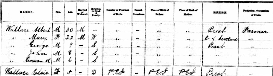 | Census | He was head of the household in the census on 9 April 1891 in Lot 9, Prince County, Prince Edward Island, CanadaG. included in the household with Albert (age 30) was his wife Mary MacNevin (age 32), their children George (age 9), John (age 8), Cowan (Age 6) and Elsie (age 5). Albert was a farmer. Albert and the children were Presbyterian, his wife was a member of the Church of Scotland.5 1891 Canada Census, Lot 9, Prince County, Prince Edward Island. Household of Albert Wallace, his wife Mary MacNevin, their children George, John, Cowan and Elsie. |