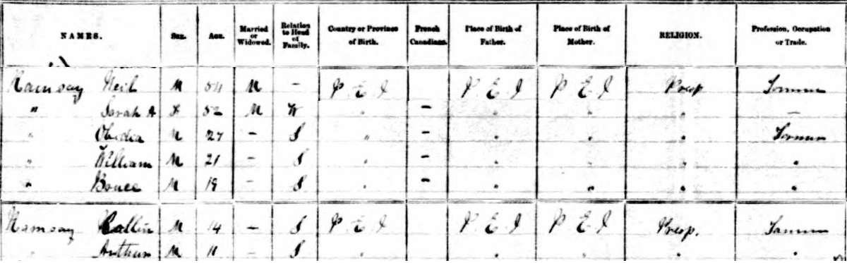 | Witness | He was enumerated on the census in 1891 in the household of Neil Ramsay in Lot 13, Prince County, Prince Edward Island, CanadaG. included in the family with Neil (age 54) were his wife Sarah WAllace (age 52), their children Obadiah (age 27), William (age 21), Bruce (age 19), Colin (age 14) and Arthur (age 11). Neil and his sons were farmers. The family religion was Presbyterian.5 1891 Canada Census, Lot 13, Prince County, Prince Edward Island. Household of Neil Ramsay, his wife Sarah Wallace, their sons Obadiah, William, Bruce, Colin & Arthur. Census image courtesy of Library & Archives Canada. |