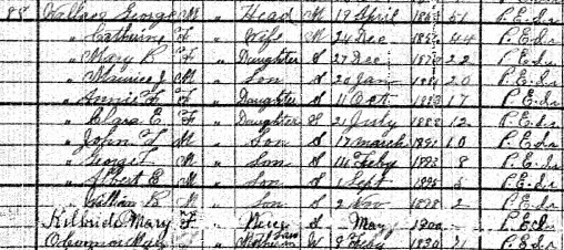 | Census | He was head of the household in the census on 31 March 1901 in Lot 3, Prince County, Prince Edward Island, CanadaG. included in the household were George's wife Catherine (O'Connor), sons Maurice, John, George, Albert & William, daughters Mary, Annie & Clara, and mother-in-law Mary O'Connor. In addition, there was a Mary Kilbride, age 1 year, a niece, whose parents are not known at this writing. The family religion was Roman Catholic. George was a farmer.5 1901 Canada Census, Lot 3, Prince County, Prince Edward Island. Household of George & Catherine (O'Connor) Wallace. Included in the household were George's wife Catherine (O'Connor), sons Maurice, John, George, Albert & William, daughters Mary, Annie & Clara, and mother-in-law Mary O'Connor. |