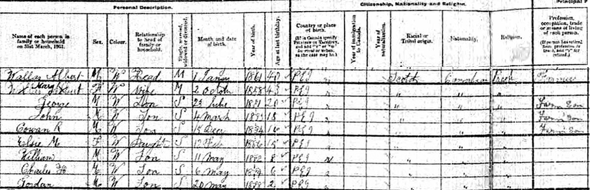 | Census | He was head of the household in the census in 1901 in Lot 9, Prince County, Prince Edward Island, CanadaG. included in the household with Albert (age 40) was his wife Mary MacNevin (age 43), their children George (age 20), John (age 18), Cowan (Age 16), Elsie (age 15), William (age 8), Charles (age 6) and Gordon (age 2). Albert was a farmer, and George, John & Cowan were farmer's sons. The family religion was Presbyterian.6 1901 Canada Census, Lot 9, Prince County, Prince Edward Island. Household of Albert Wallace, his wife Mary MacNevin, their children George, John, Cowan, Elsie, William, Charles and Gordon. |