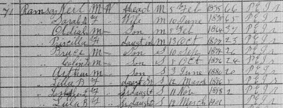 | Witness | He was enumerated on the census in 1891 in the household of Neil Ramsay in Lot 13, Prince County, Prince Edward Island, CanadaG. included in the family with Neil (age 54) were his wife Sarah WAllace (age 52), their children Obadiah (age 27), William (age 21), Bruce (age 19), Colin (age 14) and Arthur (age 11). Neil and his sons were farmers. The family religion was Presbyterian.2 1891 Canada Census, Lot 13, Prince County, Prince Edward Island. Household of Neil Ramsay, his wife Sarah Wallace, their sons Obadiah, William, Bruce, Colin & Arthur. Census image courtesy of Library & Archives Canada. |