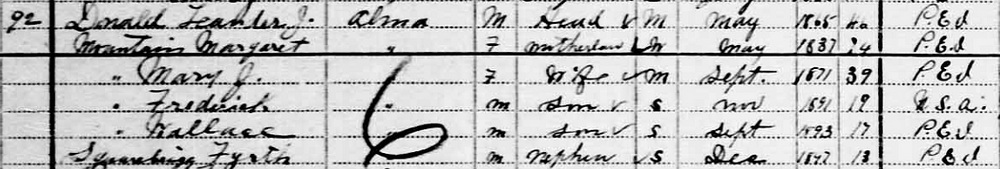 - [S4134] 1911 Canada Census - Leander J. Donald, Page 12, Household #92, 1 June 1911, Microfilm. Alma, Prince County, Prince Edward Island, Lot 25, District 140, Page 3, Line 36. Library & Archives Canada, Library & Archives Canada; 395 Wellington St., Ottawa,, Ontario, Canada.