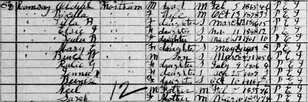| Census | Obadiah Ramsay was head of the household in the census on 19 June 1911 in Northam, Prince County, Prince Edward Island, CanadaG. included in the household were Obadiah's wife Priscilla (Gorrill), daughters Lilla B., Elsie J., Lulu B., Mary E., Rubie G., Jennie R. & Bernise, son Bruce W., and Obadiah's parents, Neil and Sarah (Wallace) Ramsay. The family religion was Presbyterian. Obadiah was a farmer.4 1911 Canada Census, Northam, Prince County, Prince Edward Island. Household of Obadiah Ramsay. Included in the household were Obadiah's wife Priscilla (Gorrill), daughters Lilla B., Elsie J., Lulu B., Mary E., Rubie G., Jennie R. & Bernise, son Bruce W., and Obadiah's parents, Neil and Sarah (Wallace) Ramsay. The family religion was Presbyterian. Obadiah was a farmer. |