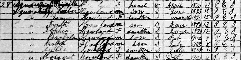 | Witness | Hugh Fyrth Squarebriggs was enumerated on the census in June 1911 in the household of Priscilla Mountain in Howlan; Lot 5, Prince County, Prince Edward Island, CanadaG. Priscilla was head of the household. Living with her were sons Heber, Fyrth, Carlyle & Ralph, and daughters Jenny, Sophia, Sybil and Margaret. The family religion was Presbyterian. The only employed member of the family was Priscilla's son Heber, as a chauffeur.4 1911 Canada Census, household of widow Priscilla (Mountain) Squarebriggs. Living with her were sons Heber, Fyrth, Carlyle & Ralph, and daughters Jenny, Sophia, Sybil and Margaret. The family religion was Presbyterian. The only member of the family was Priscilla's son Heber, as a chauffeur. |