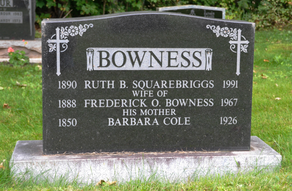 Inscription: BOWNESS / 1890 Ruth B. Squarebriggs 1991 / Wife of / 1888 Frederick O. Bowness 1967 / His Mother / 1850 Barbara Cole 1926.2,3  Tombstone, Frederick O. Bowness (1888-1967), his wife Ruth Bell Squarebriggs (1890-1991), his mother Barbara Cole (1850-1926). United Church Cemetery, Montrose, Prince County, Prince Edward Island.