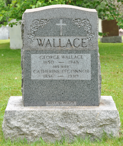 | Burial | He was buried in Sacred Heart Roman Catholic Cemetery, Alberton, Prince County, Prince Edward Island, Canada, 46.80555, -64.06449G. Inscription: WALLACE / George Wallace / 1850 - 1948 / His Wife / Catherine O'Connor / 1856 - 1930 / Rest in Peace.2,7 Tombstone, George Wallace (1850-1948) and his wife Catherine O'Connor (1856-1930). Sacred Heart Roman Catholic Cemetery, Alberton, Prince County, Prince Edward Island, Canada. |