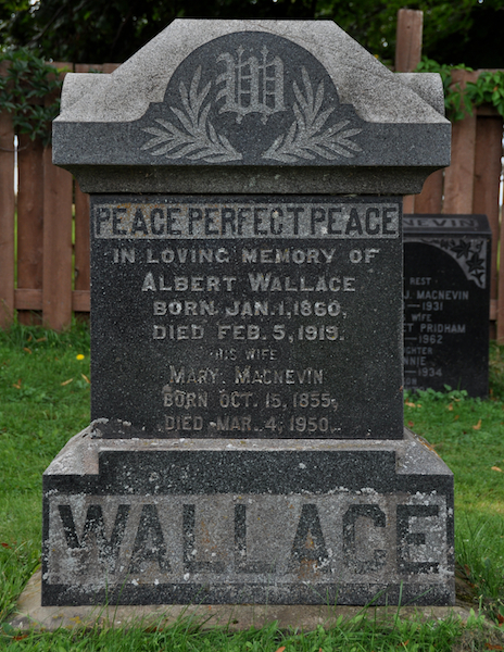 | Burial | He was buried in the Free Church of Scotland Cemetery, Milo, Prince County, Prince Edward Island, Canada, 46.64707, -64.22136G. Inscription: Peace Perfect Peace / In Loving Memory of / Albert Wallace / Born Jan. 1, 1860, / Died Feb. 5, 1919. / His Wife / Mary MacNevin / Born Oct. 15, 1855 / Died Mar. 4, 1950 / WALLACE.3 Tombstone, James Albert Wallace (1862-1919), his wife Mary MacNevin (1855-1950). Free Church of Scotland Cemetery, Milo, Prince County, Prince Edward Island, Canada. |