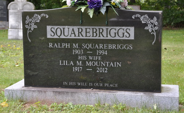 Inscription: SQUAREBRIGGS / Ralph M. Squarebriggs / 1903 - 1994 / His Wife / Lila M. Mountain / 1917 - 2012 / In His Will is Our Peace.4  Tombstone, Ralph M. Squarebriggs (1903-1994), his wife Lila M. Mountain (1917-2012). United Church Cemetery, Montrose, Prince County, Prince Edward Island.