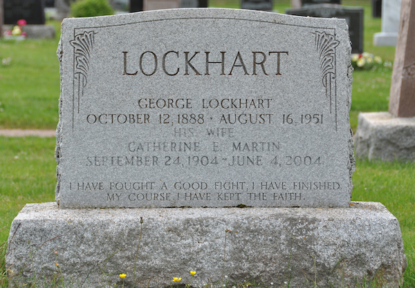 | Burial | He was buried in the Peoples Cemetery, Kensington, Prince County, Prince Edward Island, Canada, 46.44783, -63.62904G. inscription: LOCKHART / George Lockhart / October 12, 1888 - August 6, 1951 / His Wife / Catherine E. Martin / September 24, 1904 - June 4, 2004 / I have fought a good fight, I have finished / my course, I have kept the faith.6,7 Tombstone, George Lockhart and his wife, Catherine E. Martin. The Peoples Cemetery, Kensington, Prince County, Prince Edward island. |