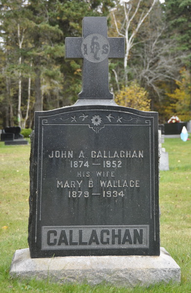 | Burial | She was buried in Sacred Heart Roman Catholic Cemetery, Alberton, Prince County, Prince Edward Island, Canada, 46.80587, -64.06430G. Inscription: John A. Callaghan / 1874 - 1952 / His Wife / Mary B. Wallace / 1879 - 1934 / CALLAGHAN.6 Tombstone, John A. Callaghan (1874-1952), his wife Mary Bernice Wallace (1879-1934). Sacred Heart Roman Catholic Cemetery, Alberton, Prince County, Prince Edward Island, Canada. |