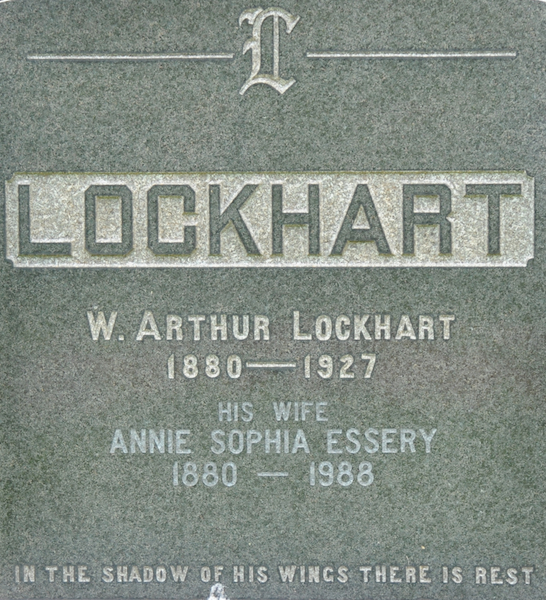 | Burial | He was buried in the Peoples Cemetery, Kensington, Prince County, Prince Edward Island, Canada, 46.44818, -63.62929G. Inscription: LOCKHART / W. Arthur Lockhart / 1880-1927 / His Wife / Annie Sophia Essery / 1880-1988 / In the shadow of his wings there is rest. Back: Reginald A. Lockhart / 1906-1989 / Marion G. Lockhart / Widow of / Charles Kennedy / 1912-2006 / Prov. 3: 5-6.7 Tombstone, William Arthur Lockhart (1880-1927), his wife Annie Sophia Essery (1880-1988), son Reginald A. Lockhart (1906-1989), daughter Marion G. Lockhart (1912-2006). The Peoples Cemetery, Kensington, Prince County, Prince Edward Island, Canada.  Tombstone, William Arthur Lockhart (1880-1927), his wife Annie Sophia Essery (1880-1988), front detail.  Tombstone, William Arthur Lockhart (1880-1927), his wife Annie Sophia Essery (1880-1988), back detail. |