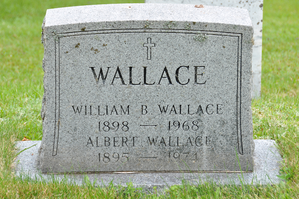 | Burial | He was buried in Sacred Heart Roman Catholic Cemetery, Alberton, Prince County, Prince Edward Island, Canada, 46.80563, -64.06443G. Inscription: WALLACE / William B. Wallace / 1898 - 1968 / Albert Wallace / 1895 - 1974.5,3 Tombstone, William B. Wallace (1898-1968) and his brother Albert (1895-1974). Sacred Heart Roman Catholic Cemetery, Alberton, Prince County, Prince Edward Island, Canada. |