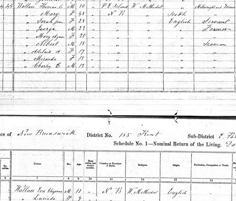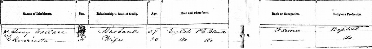 | Witness | Henrietta Price was enumerated on the census in 1861 in the household of Henry Wallace in Wellington Parish, Kent County, New BrunswickG. included in the household with Henry (age 37) was his wife Henrietta (age 23). He was a farmer. Their religion was Baptist.5 1861 Canada Census, Wellington Parish, Kent County, New Brunswick. Household of Henry & Henrietta (Price) Wallace. |
