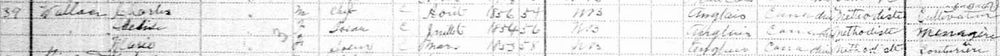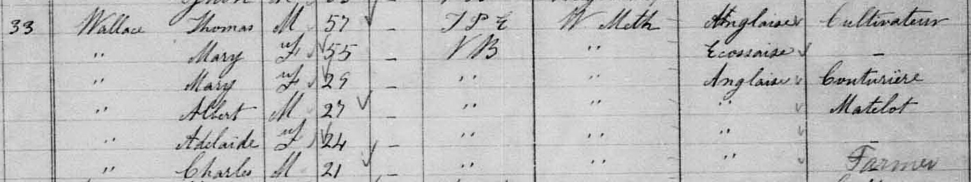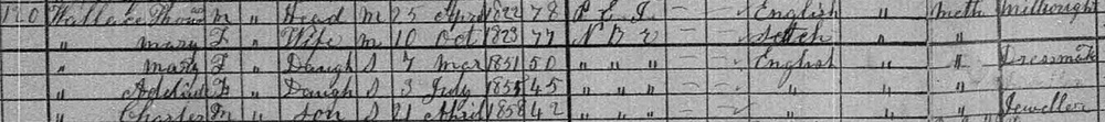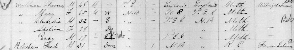| Witness | He was enumerated on the census in April 1881 in the household of Henry Wallace in Moncton, Westmorland County, New Brunswick, CanadaG. Included in the household with Henry (age 60) was his wife Henrietta (age 43), and their children Warren (age 17), Caleb (age 14), William (age 12), Ella (age 6), Henry (age 2) and Gorden (age 1 month). Henry was a labourer. The family religion was Baptist.6 1881 Canada Census, Moncton, Westmorland County, New Brunswick. Household of Henry & Henrietta (Price) Wallace, and their 6 children. |