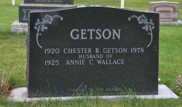 | Burial | He was buried in Greenmount Cemetery, Greenmount, Prince County, Prince Edward Island, Canada, 46.90623, -64.03516G. Inscription: GETSON / 1920 Chester B. Getson 1978 / Husband of / 1925 Annie C. Wallace / Forever in Our Hearts.2 Tombstone, Chester B. Getson (1920-1978). Greenmount Cemetery, Greenmount, Prince County, Prince Edward Island, Canada. |