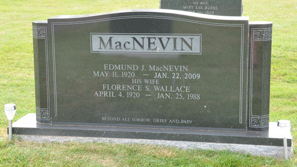 | Burial | She was buried in the Presbyterian/United Cemetery, Brae, Prince County, Prince Edward Island, Canada, 46.66055, -64.19206G. Section E, Stone 94A. Inscription: MACNEVIN / Edmund J. MacNevin / May 11, 1920 - Jan. 22, 2009 / His wife / Florence S. Wallace / April 4, 1920 - Jan. 25, 1988 / Beyond all sorrow, grief and pain.3 Tombstone, Edmund J. MacNevin (1920-2009) & Florence Sybil Wallace (1920-1988). United Church Cemetery, Brae, Prince County, Prince Edward Island. |