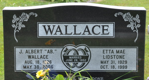| Burial | She was buried in the Presbyterian/United Cemetery, Brae, Prince County, Prince Edward Island, Canada, 46.66020, -64.19199G. Section A, Stone 3A. Inscription: WALLACE / J. Albert "Ab." / Wallace / Aug. 18, 1926 / May 30, 2006 | Married / June 28, 1952 | Etta Mae / Lidstone / May 31, 1929 / Oct. 18, 1999. // Life's work well done.2 Tombstone, James Albert Wallace (1926-2006) & Etta Mae Lidstone (1929-1999). United Church Cemetery, Brae, Prince County, Prince Edward Island. |