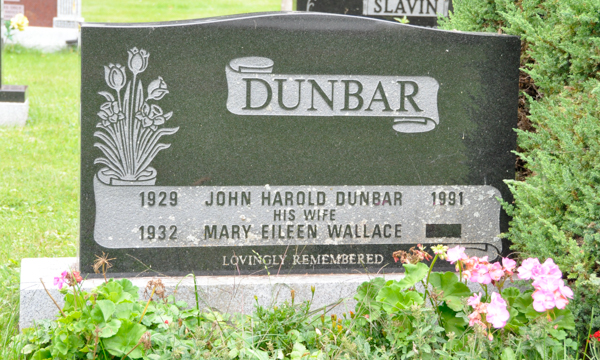 Inscription: WALLACE / 1881 Gordon B. 1953 / His Wife / 1888 M. Pearl 1983 / Their Daughter / 1910 Grace E. 1943.1,11  Tombstone, Gordon Baxter Wallace (1880-1953), his wife Minnie Pearl Brown (1888-1983), their daughter Edna Grace (1910-1943). Elmwood Cemetery, Moncton, Westmorland County, New Brunswick, Canada.