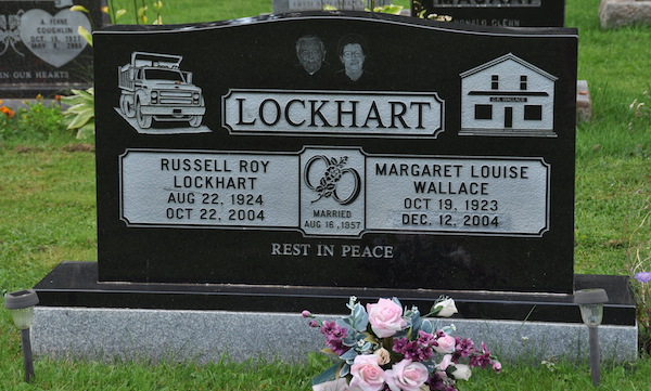 | Burial | He was buried in the Free Church of Scotland Cemetery, Milo, Prince County, Prince Edward Island, Canada, 46.64678, -64.22111G. Inscription: LOCKHART / Russell Roy / Lockhart / Aug. 22, 1924 / Oct. 22, 2004 | Married / Aug. 16, 1957 | Margaret Louise Wallace / Oct. 19, 1923 / Dec. 12, 2004.1 Tombstone, Russell Roy Lockhart (1924-2004), his wife Margaret Louise Wallace (1923-2004). Free Church of Scotland Cemetery, Milo, Prince County, Prince Edward Island, Canada. |