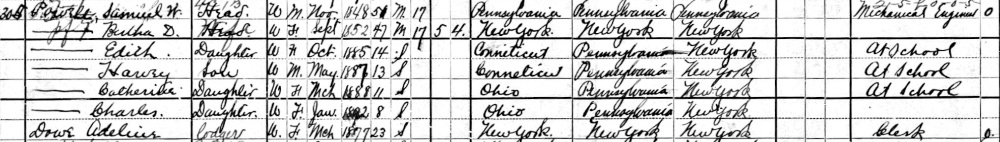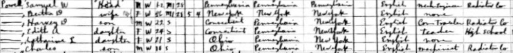 | Census | He was head of the household in the census in 1910 in Buffalo Ward 20, Buffalo, Erie County, New York, USAG. included in the household were his wife Bertha (Dowe), daughters Edith & Ketherine, and sons Harvey & Charles. Samuel's occupation was listed as mechanical engineer, Radiator Co., Harvey (illegible), Radiator Co., Edith as a high school teacher, and Charles as a machinist, Radiator Co.3 1910 US Census, household of Samuel & Bertha (Dowe) Powell and family, Buffalo, Erie County, New York. |