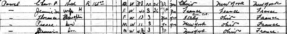 | Census | He was head of the household in the census on 1 January 1920 in Buffalo, Erie County, New York, USAG. included in the household were his wife Jeanne, daughter Florence (born in Italy, now a US citizen) and son Pierre. His occupation was a mechanical foreman for Radiator Works.3 1920 US Census, household of Charles C. Powel, wife Jeanne, daughter Florence and son Pierre. Buffalo, Erie County, New York. |