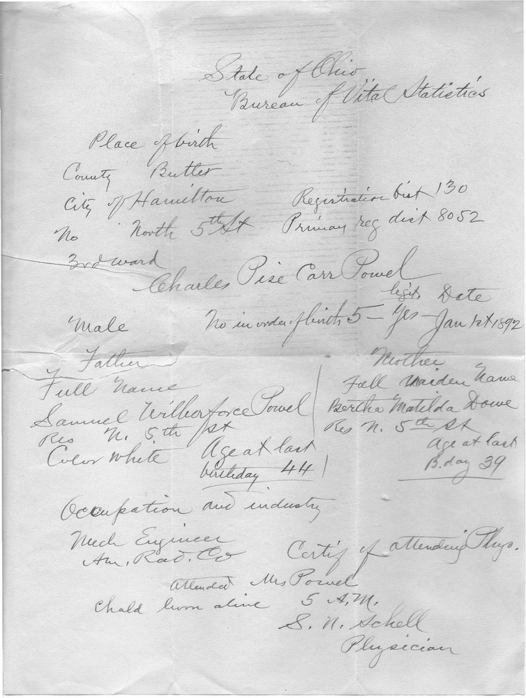 | Birth | He was born on 1 January 1892, in Hamilton, Butler County, Ohio, USAG. the birth confirmation letter from the Ohio Bureau of Vital Statistics shows that Charles was the youngest of five children. Presumably, there is a sibling who died young and for whom we lack any birth information.4,1,5,2 Birth confirmation letter, requested by the Dole Town Hall, Jura, France, prior to his marriage to Jeanne Glor (copy courtesy of Juliette Powel). |