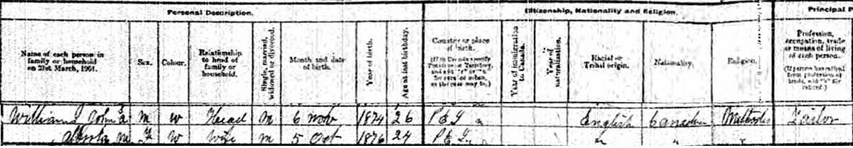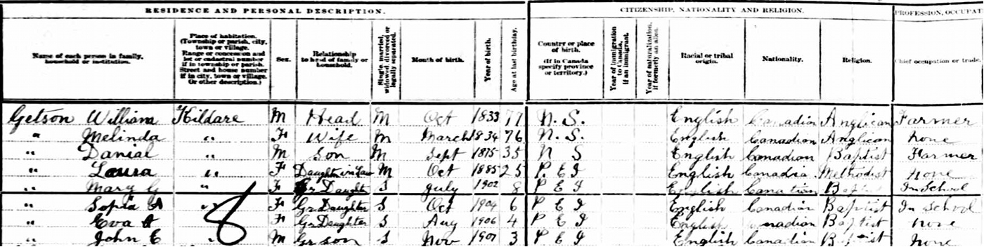 | granddaughter | She was enumerated on the census on 25 May 1901 in the household of James Dalzell, as a granddaughter, in Lot 19, Prince County, Prince Edward Island, CanadaG.1 1901 Canada Census, Lot 19, Prince County, Prince Edward Island. Household of James Dalzell/Delziel, his wife Ellen (Jamieson), their son William & his wife Louisa Jane (Waite), and grandchildren Robert, Frank, Mary, Edson, Ina, Louise, Jarvis and Gerald. |
