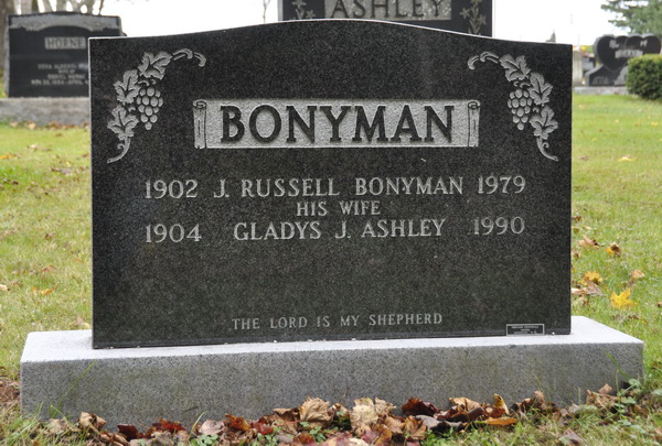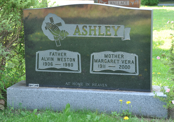 | Burial | She was buried in the United Church Cemetery, Cascumpec, Prince County, Prince Edward Island, Canada, 46.76383, -64.10789G. Inscription: ASHLEY / In Loving Memory of / Rhodes H. Ashley / Sept. 29, 1899 - July 15, 1972 / His wife / Mary Gladys Getson / July 12, 1902 - Apr. 21, 1997 / In his will is our peace.1 Tombstone, Harry Rhodes Ashley and his wife, Mary Gladys Getson. United Church Cemetery, Cascumpec, Prince County, Prince Edward Island, Canada. |